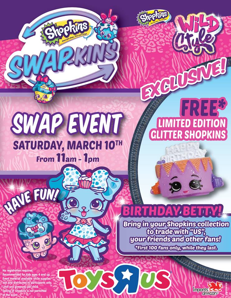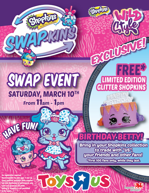 Don’t miss out on your chance to get wild at Toys “R” Us on Saturday, March 10th from 11AM-1PM for a fun Swap Event and you could get a FREE Limited Edition Glitter Shopkins!