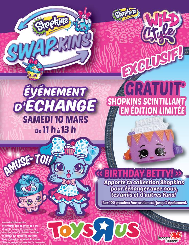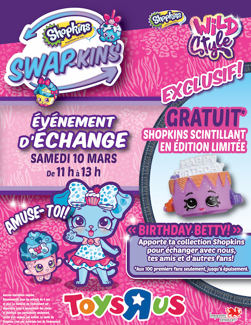 Ne manquez pas votre chance de vous déchainer chez Toys “R” Us le samedi 10 mars de 11h00 à 13h00 pour un évènement amusant d’échange et vous pourriez obtenir un Shopkin scintillant en édition limitée GRATUITEMENT!