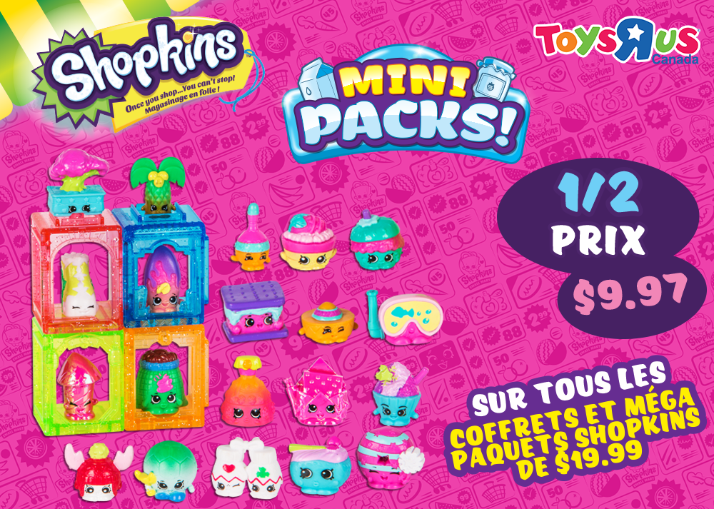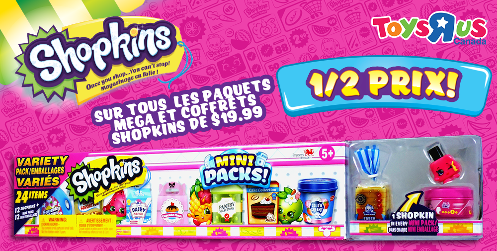 1/2 prix $9.97 sur tous les coffrets et méga paquets Shopkins de $19.99 chez Toys "R" Us!